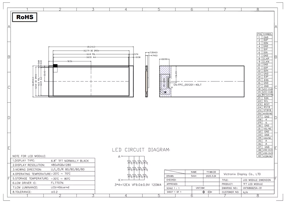 TFT LCD on teatud tüüpi vedelkristallide ekraanil, mis kasutab pildikvaliteedi suurendamiseks õhukese kilega transistori tehnoloogiat ja sellel on igapäevaelus arvukalt rakendusi. Mis teeb Hiinas professionaalse TFT -mooduli tootja ja tarnijana, mis teeb Victronixi 6,86 tolli 480 × 1280 IPS TFT mooduli teistest tootjatest erinevaks? Alguses pakub see tüüpilist heledust 450 cd/m², 16,7 m värvi, laia vaatenurgaga 80 ° (tüüpiline) kõigis suundades ja kontrasti suhe 800: 1, tagades suurepärase loetavuse erinevate nurkade alt. Teiseks integreerib see taustvalgustuse, kasutades 3 × 4 valget LED -i, mille eluaegne eluaeg on 30 000 kuni 50 000 tundi (kuni 50% esialgse heleduseni), tagades selge nähtavuse kõigis valgustingimustes. Lisaks kasutab see kiire andmeedastuse ja lihtsustatud integreerimise jaoks 4 -realist Mipi DSI-liidest. Lisaks läbib see range keskkonnatesti, sealhulgas kõrge/madala temperatuuri ladustamise ja töö, temperatuuri tsükli, niiske soojuse (õhuniiskuse) testimine, nii et see saaks sujuvalt toimida laiendatud temperatuuride vahemikus -20 ° C kuni +70 ° C.
