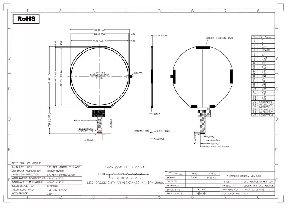 TFT -moodulit võib leida kõikjal elus. Mis teeb selle Victronixi 7 -tollise 1080 × 1080 ümmarguse IPS TFT LCD teistest tootjatest erinevaks? Alguses tagavad selle 500 CD/m² heledus, 800: 1 kontrasti suhe ja vaatenurgad 80 ° kõigis suundades tagavad erksad kujutised. Teiseks toetab seade kiire andmeedastuse jaoks FL5893DC kontrolleriga 4-radast MIPI liidest. Lisaks on sellel 32 valget LED -taustvalgust, mille eluiga on 30 000–50 000 tundi, tagades usaldusväärse jõudluse erinevates tööstuslikes rakendustes. Lisaks vastab see ROHS-i standarditele ja läbib rangeid töökindluse teste (termiline šokk, niiskus, ladustamine), et töötada veatult ekstreemsetel temperatuuridel (-20 ° C kuni +70 ° C) ja taluda karmi säilitamistingimusi (-30 ° C kuni +80 ° C).