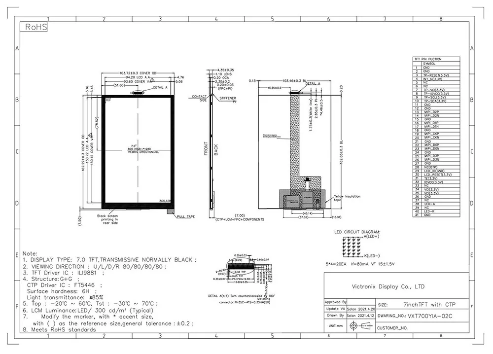 VXT700YIA-02C on TFT-LCD moodul. See koosneb TFT-LCD-paneelist, draiveri IC, FPC, tagatulest ja CTP-st. 7,0 ¢¢ ekraan sisaldab 800 x (RGB) x 1280 pikslit ja võib kuvada kuni 16,7 miljonit värvi. See toode on kooskõlas ROHSi keskkonnakriteeriumiga.